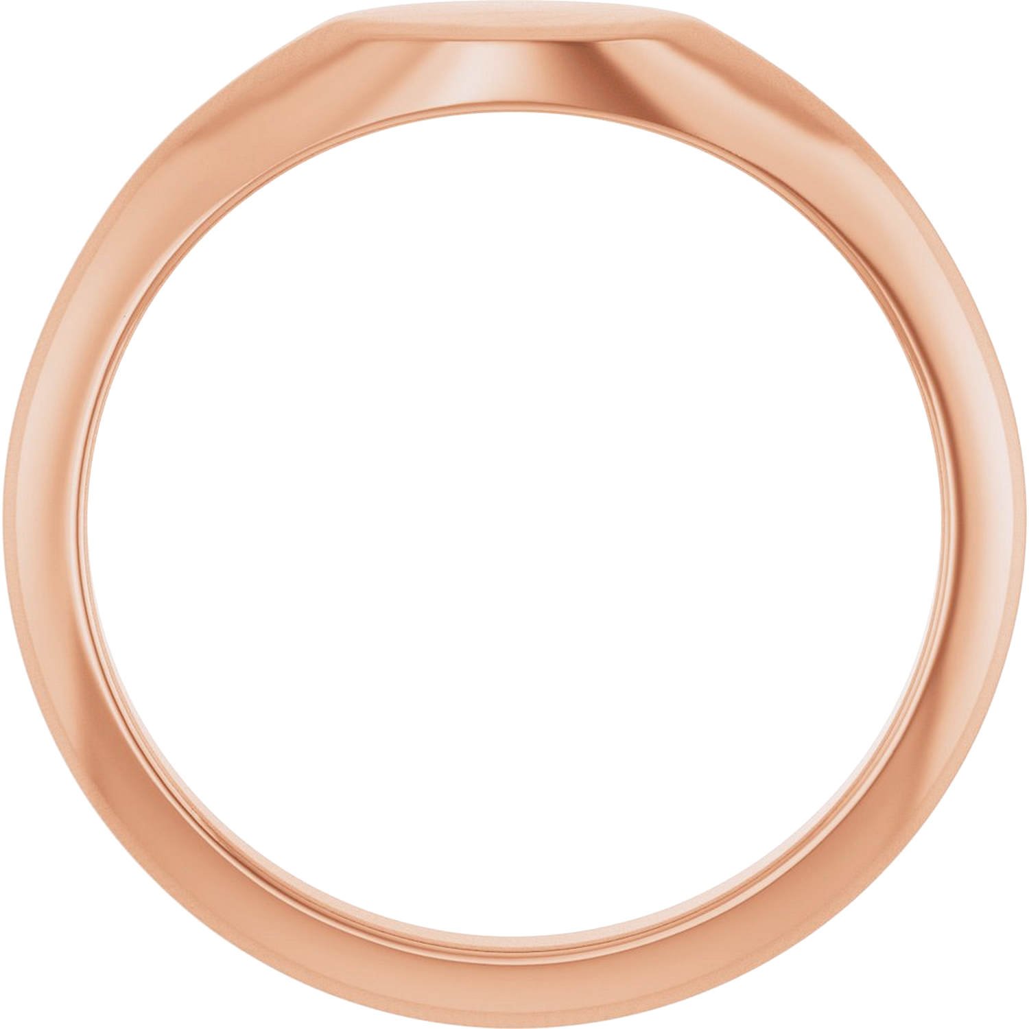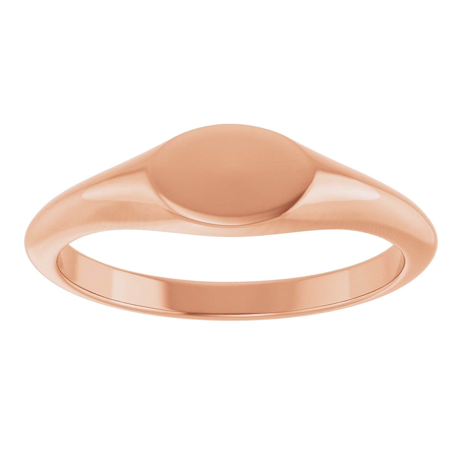 This 14K Rose Gold Engravable Oval Signet Ring features fine jewelry-quality craftsmanship, distinguished by its brushed finish and elegant oval design. A single letter can be engraved on the top of the ring; its compact size allows it to be worn as a stylish pinky ring. It offers a chic and minimalist accessory for everyday wear.